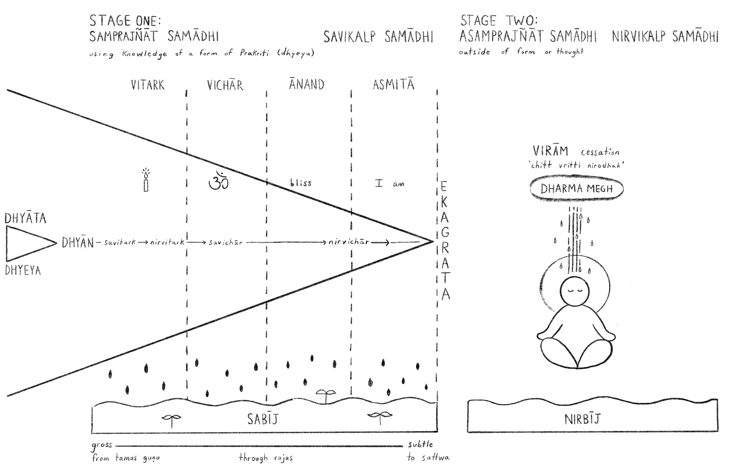 How to use: The stages of samādhi are divided into two: meditation by using an anchor for one’s focus; and meditation outside of form or thought. The first stage, samprajñāt (or ‘with form’) is subdivided into four categories, with the first two categories being subdivided even further. Follow the trajectory from the triad (triputi) of meditator (dhyāta) meditating (dhyān) on the meditated (dhyeya) through the stages of samādhi, all the way through to a singular, razor beam of focus (ekagrata).